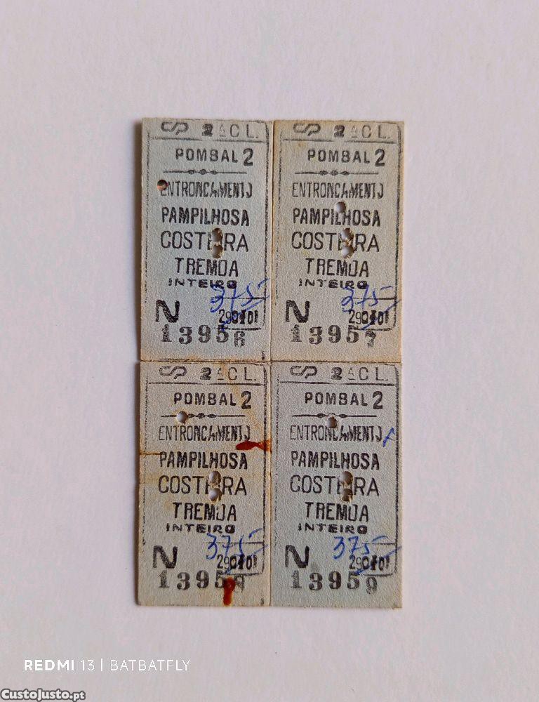 4 bilhetes de comboio de 2a CL da CP, Pombal 2 - Entroncamento - Pampilhosa - Costeira - Tremoa, inteiro.