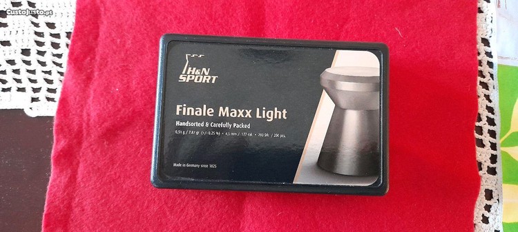 Chumbos Final Maxx Light da H&N calibre 4.5.Chumbos de alta precisão para 10 metros mas são também bastantes precisos até 20 mts.Chumbos de excelente qualidade com um peso médio de 51gr e todos escolhidos à mão sem qualquer rebarba ou imperfeição.Caixa encetada tem 150 chumbos deixei de atirar e sobraram me estes.