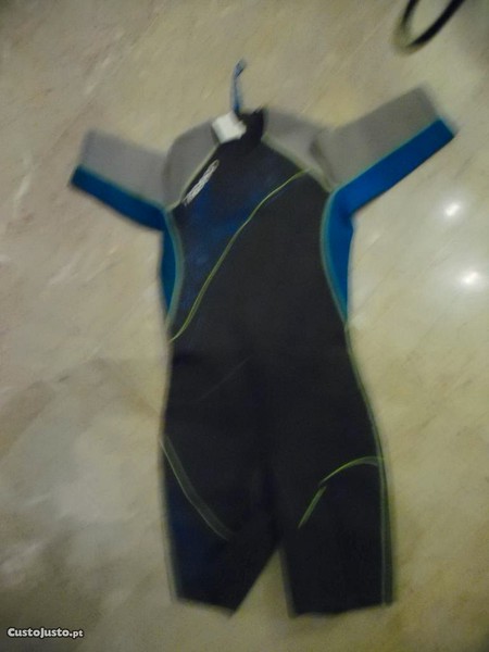 2. Fato Shorty, marca Tribord, tamanho 12 anos, para jovem praticante ocasional de desportos náuticos. Composição 90% neoprene e 10% poliamida. Passar por água corrente depois de cada utilização. Não deixar secar ao sol. Com muito pouco uso (novo custa 21E).