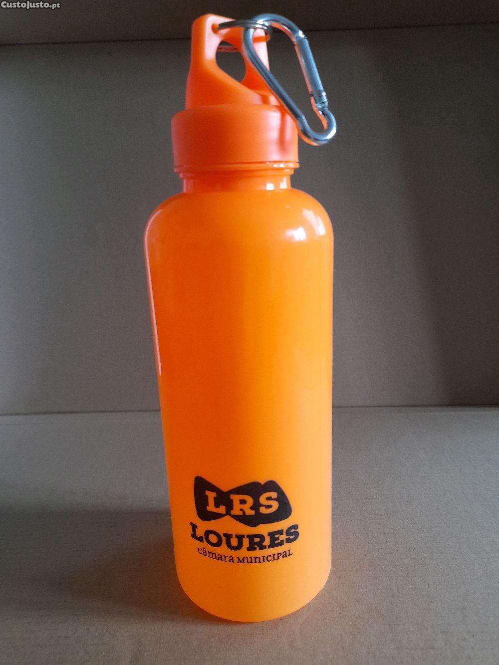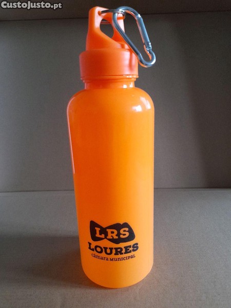 Garrafa reutilizável de plástico para líquidos, destinada ao uso quotidiano ou em vários tipos de desportos. De cor laranja fluorescente, tem referência à Câmara Municipal de Loures e capacidade de 500 ml. Mede 17 cm de altura, 7 cm de diâmetro e possui um mosquetão para pendurar. Barato para desocupar. Negociável, vendo pela melhor oferta. Possibilidade de entrega em mão.