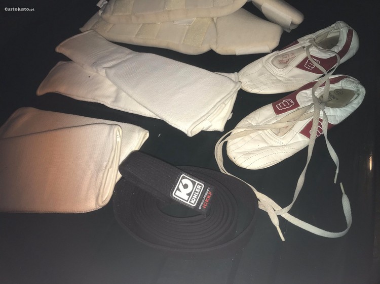 Proteccoes, sapatilhas e cinto negro para karate em bom estado