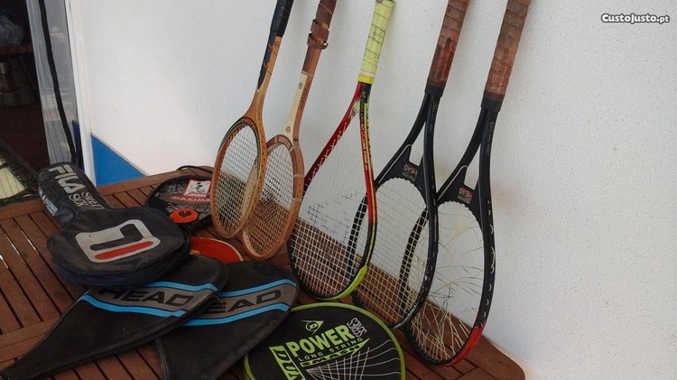 Três raquetes de ténis de campo uma Dunlop júnior 10 euros e duas head uma 20 euros e a outra a precisar de encordoamento por 15 euros, conjunto faço preço especial.As duas de madeira já vendi.