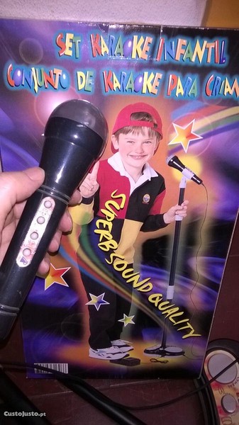Conjunto de karaoke para criança. Este conjunto é constituído pelo microfone com fios, pela base onde está o amplificador com altifalantes e por um pedal para activar os ritmos de acompanhamento.