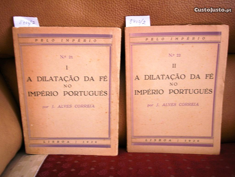 N 8400a - A Dilatação da Fé no Império Português. 2 volumes. J. Alves Correia 1936. Completa. N 21 - I. 79 Páginas. N 22 - II. 84 Páginas. Com dedicatória a Bertha Maia, viúva de José Carlos da Maia, manuscrita pelo autor, datada de 1936. Dimensões: 21x15 cm