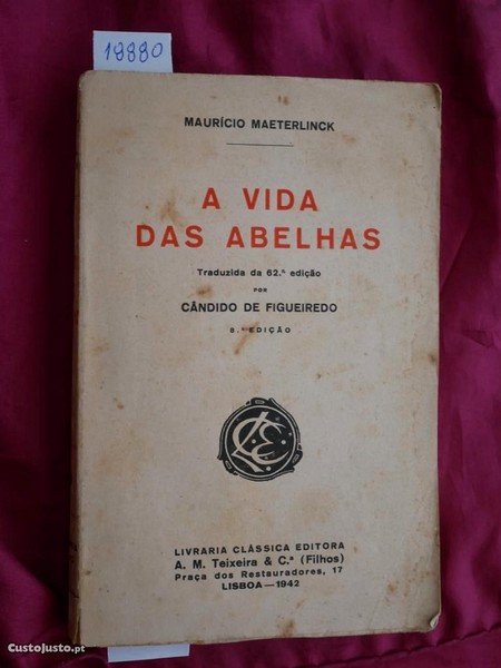 N 18880 A vida das Abelhas / Maurício Maeterlinck ( Lisboa, Livraria Clássica Editora de A. M. Teixeira 1942); 19 cm.-B. Traduzida da 62 Edição por Cândido de Figueiredo. 8 Edição. 255 Pgs.