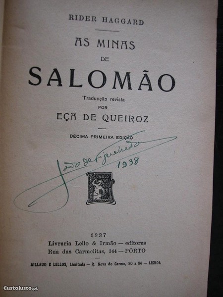 N 9803 As Minas de Salomão. Rider de Haggard. Tradução revista por Eça de Queiroz. Lello & Irmãos Editores 1937. 19x13cm. 298 Pgs. Assinatura de posse. Encadernado