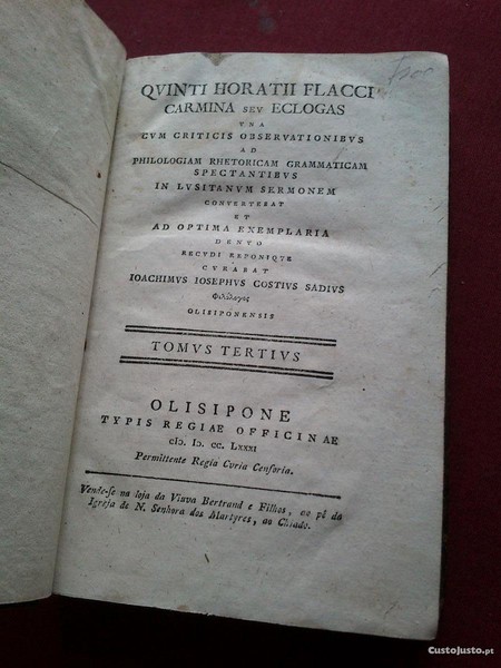 Quinti Horatii Flacci Carmina Sev Eclogas Una Cum Obseravationibus Ad Philologiam Rhetoricam Grammaticam Spectantibus In Lusitanum Sermonem Convertebat Et Ad Optima Exemplaria Denvo Recudi Reponique Curabat Ioachimus Ioseph Costius Sadius-Olisiponensis-Tomus Tertius-Olisipone-Typis Regiae Officinae-MCCLXXXI-Permittente Regia Curia Censoria-Vende-se na Loja da Viúva Bertrand e Filhos