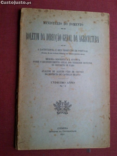 Ministério do Fomento-Boletim da Direcção Geral da Agricultura-A Lacticultura e Seus Produtos em Portugal (Resumo da Sua Evolução Industrial nos Últimos Quarenta Anos) por Adolpho Batista Ramires// Memória Descriptiva e Succinta Sobre o Reconhecimento Geral dos Terrenos Incultos no Districto de Faro por Carlos Romeu Correia Mendes// Analyse de Alguns Pães de Centeio do Districto de Castello Branco por Fernando Le Cocq-Undecimo Anno-Nº 1-Imprensa da Universidade-Coimbra-1911