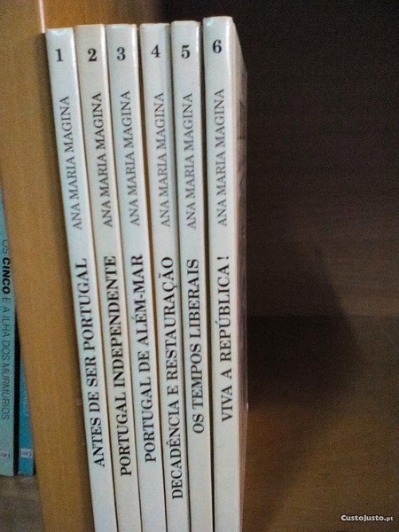 Coleção Meu Portugal Minha História. São 6 livros: Antes de ser Portugal, Portugal Independente, Portugal de Além-Mar, Decadência e Restauração, Os tempos Liberais e Viva a República, de Ana Maria Magina e ilustrações de Sérgio Soldá, Editora Desabrochar, a partir dos 8 anos.