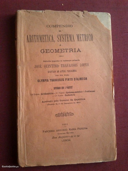 Compêndio de Arithmetica,Systema Métrico e Geometria Pelo Fallecido Inspector de Instrucção Primária José Quintino Travassos Lopes // Adaptado ao Actual Programma por Sua Filha Olympia Travassos Pinto D'Almeida // Dividido Em 3 Partes-1.ª Parte:Arithmetica;2.ª Parte:Systema Métrico-Problemas;3.ª Parte:Geometria //Aprovado Pelo Governo da República (Decreto de 10 de Dezembro de 1910)-Parceria António Maria Pereira-Lisboa-1911