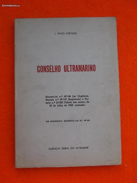 Livro de J. Pinto Furtado - Conselho Ultramarino . Editor: Agência-Geral do Ultramar de 1969 com 163 páginas de capa mole . Livro em muito bom estado . Inclui portes em correio normal .