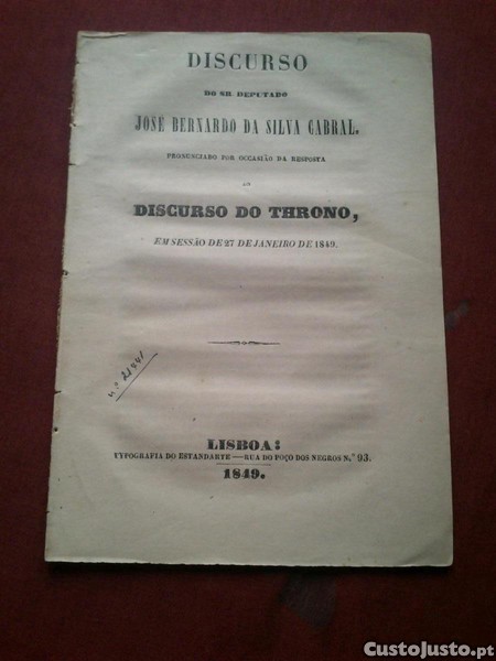 Preço: 5 €Discurso do Trono-José Bernardo Da Silva Cabral-27 de Janeiro de 1849