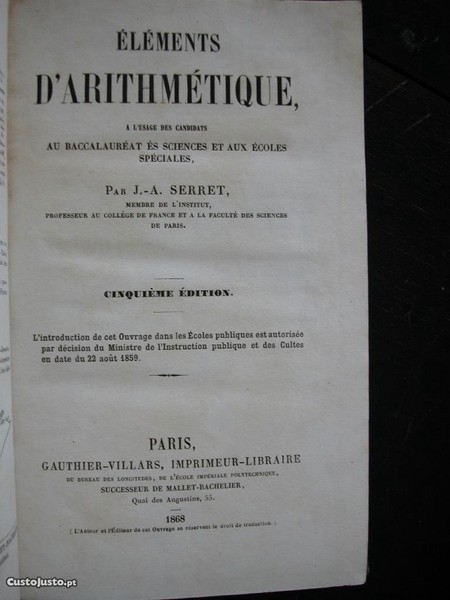 Preço: 32 €Éléments dArithmétique. J. A. Serret. 1868.