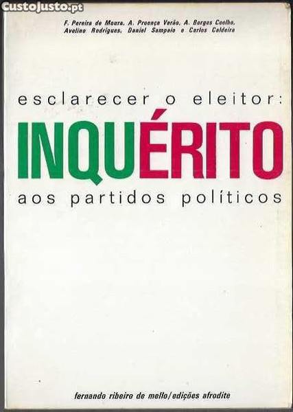 Esclarecer o eleitor: Inquérito aos partidos políticos. Contributos de F. Pereira de Moura, A. Proença Varão, A. Borges Coelho, Avelino Rodrigues, Daniel Sampaio e Carlos Caldeira, entre outros. Fernando Ribeiro de Mello / Edições Afrodite, 1975, 345 p.