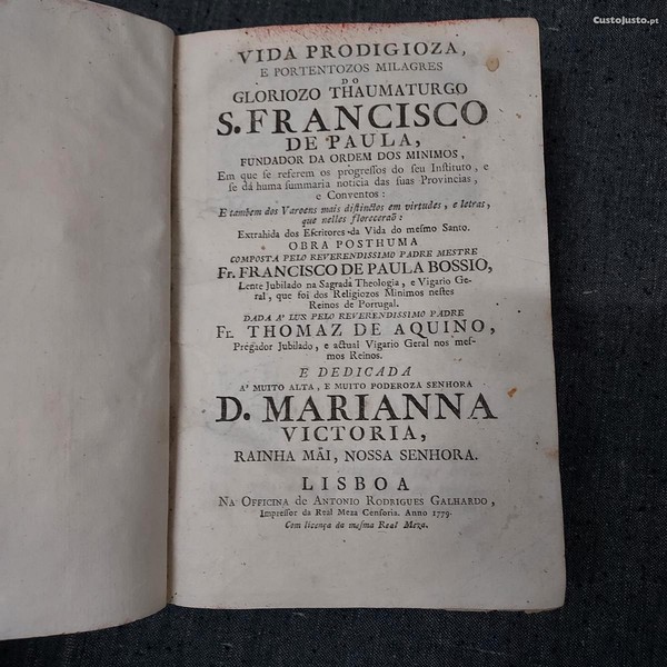 Vida prodigioza e portentozos milagres do gloriozo thaumaturgo S. Francisco de Paula // Fundador da ordem dos minimos,em que se referem os progressos do seu instituto e se dá huma summaria notícia das suas províncias e conventos // e também dos varoens mais distinctos em virtudes e letras que nelles florecerão // extrahida dos escritores da vida do mesmo santo //obra posthuma composta pelo reverendissimo padre mestre fr. Francisco de Paula Bossio,lente jubilado na sagrada ntheologia e vigário geral,que foi dos religiozos minimos nestes reinos de Portugal // dada à luz pelo reverendissimo padre fr. Thomaz de Aquino,pregador jubilado e actual vigário geral nos mesmos reinos e dedicada à muito alta e muito poderoza senhora D. Marianna Victoria,rainha mãi,nossa senhora // Lisboa,na officina de António Rodrigues Galhardo:impressor da real meza censoria-1779