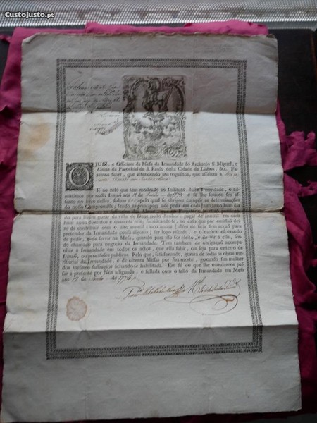 N 22189 Gravura Original da Mesa da Irmandade do Archanjo S. Miguel. E Almas da Parochial de S. Paulo desta cidade de Lisboa. Admissão de Joze dos Santos casado com Justina Roza em 12 de Junho de 1774. 50x35cm. Bom estado geral para a idade.