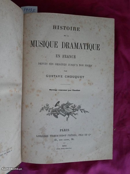 N 19135 Histoire de la Musique Dramatique en France depuis ses origines jusqua nos jours par Gustave Chouquet. Ouvrage couronné pa LInstitut . Paris Librairie Firmin Didot Frères 1873. Encaderado com lombada em pele. 17x24cm. 448 Pgs. Algumas manchas do tempo. Portes Grátis