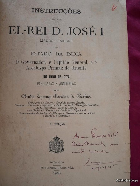 N 10528 Instrucções com que El-Rei D. José I mandou passar ao Estado da India. Monteiro de Barbuda. ( Cláudio de Lagrange). O Goverdaor Geral, e Capitão General, e o Arcebispo Primaz do Oriente no anno de 1774. Publicadas e anotadas por Secretario do Governo Geral do mesmo Estado, Capitão do Corpo de Engenheiros do Exercito de Portugal, Membro do Conservatório Real de Lisboa, e da Sociedade Promotora dIndustria Nacional, Commendador da Ordem de Christo, e Cavaleiro das da Torre e Espada, e Conceição. Imprensa Nacional. Nova Goa. 1903. 1 volume. De 26x17 cm. Com x, 95, 65, 105, e xv pags. Encadernação da Época em inteira de pele com letras a ouro. Assinatura de posse.