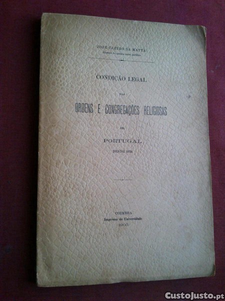 José Caeiro da Matta-Condição Legal das Ordens e Congregações Religiosas Em Portugal Desde 1834-Coimbra-Imprensa da Universidade-1905