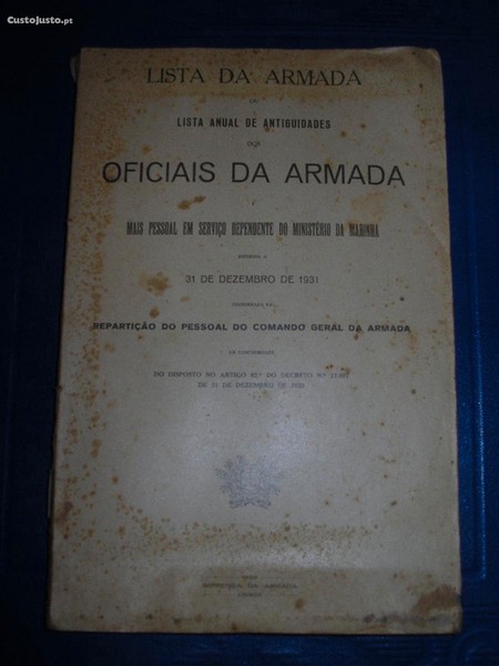 Lista da Armada ou Lista Anual de Antiguidades dos Oficiais da Armada e Mais Pessoal em Serviço Dependente do Ministério da Marinha referido a 31 de Dezembro de 1931.