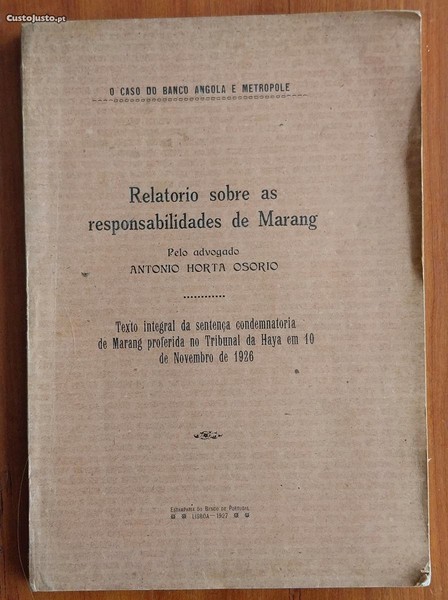 título: "O caso do Banco Angola e Metropole - Relatorio sobre as responsabilidades de Marang - Texto integral da sentença condemnatoria de Marang proferida no tribunal da Haya em 10 de Novembro de 1926"