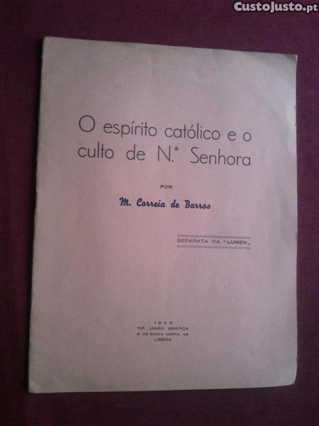 O Espírito Católico e o Culto de N.ª Senhora por M. (Manuel) Correia de Barros (Separata de "Lumen")-Tip. União Gráfica-Lisboa-1942