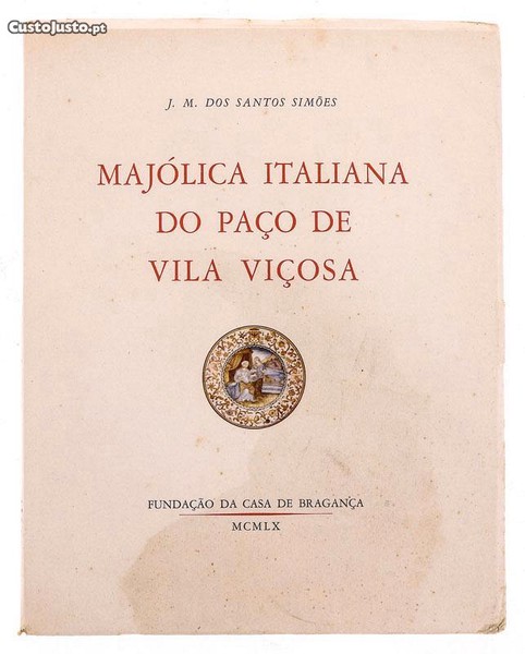 MAJÓLICA DO PAÇO DE VILA VIÇOSA - J. M. dos Santos Simões. Ano 1960. Livro com 310 páginas. Estudo sobre a colecção de majólica italiana existente no Palácio de Vila Viçosa. O termo identifica a louça sumptuária produzida nos centros de Faenza, de Orvietto, possivelmente de Florença, de Ravenna e de Forli, de Caffaggiolo, de Deruta, e sobretudo de Urbino e Castel Durante [...] que se caracteriza pela técnica da superfície inteiramente decorada com o emprego de esmaltes estaníferos, brancos ou corados, sobre os quais se pintavam ornatos ou figurações [...]. Profusamente ilustrado no texto com algumas das reproduções a cores. Muito bom estado de conservação.