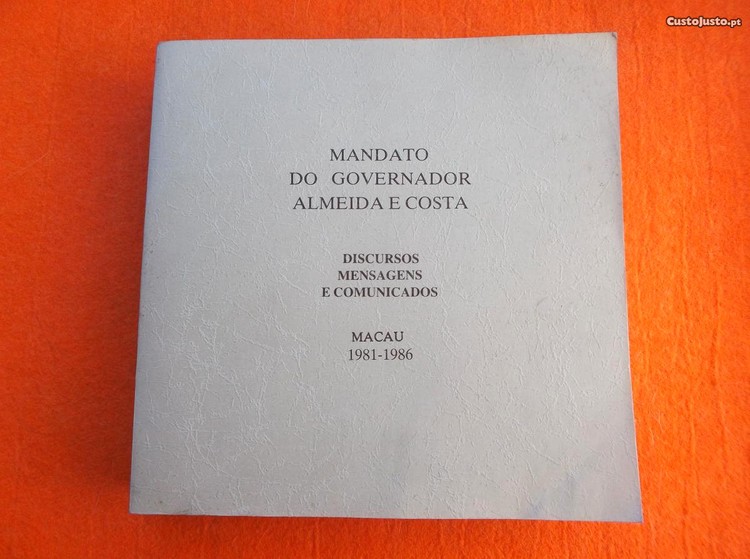 Livro Mandato do governador Almeida e Costa: discursos, mensagens e comunicados 1981 - 1986 . Pref. Monsenhor Manuel Teixeira . Publicação : Governo de Macau de 1986 com 581 páginas de capa mole . Livro em bom estado . Inclui portes em correio editorial .