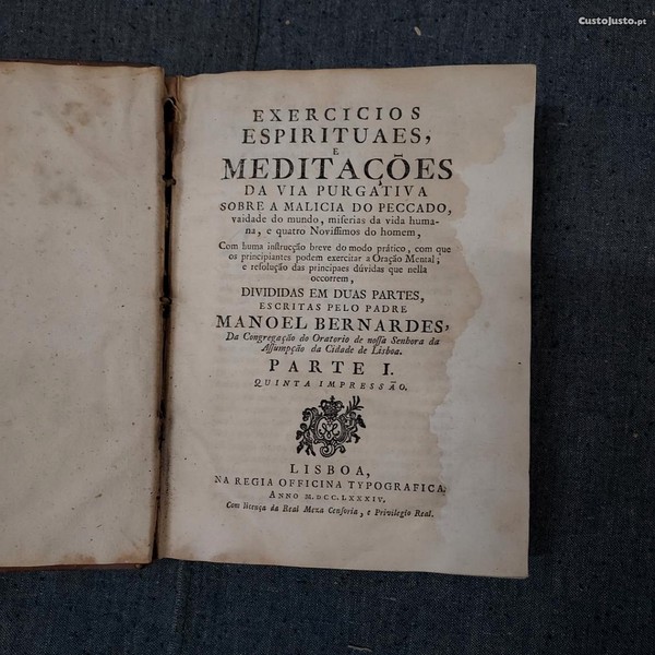 Exercícios Espirituaes e Meditações Da Via Purgativa Sobre A Malícia Do Peccado,Vaidade Do Mundo,Misérias Da Vida Humana,e Quatro Novíssimos Do Hiomem,com Huma Instrução Breve Do Modo Prático,com Que Os Principiantes Podem Executar A Oração Mental;e Resolução Das Principaes Dúvidas Que Nella Ocoorrem,divididas Em Duas Partes,escritas Pelo Padre Manoel Bernardes,da Congregação Do Oratório De Nossa Senhora Da Assumção Da Cidade De Lisboa,partes I e II,quinta Impressão.Lisboa.na Régia Officina Typographica.Anno MDCCLXXXIV/MDCCLXXV.com Licença Da Real Meza Censoria E Privilégio Real