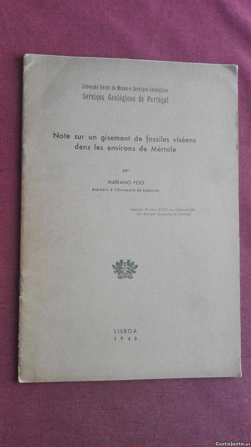 Ministério da Economia-Direcção Geral de Minas e Serviços Geológicos-Serviços Geológicos de Portugal-Note Sur un Gisement de Fossiles Viséens Dans les Environs de Mértola par Mariano Feio-Lisboa-1946