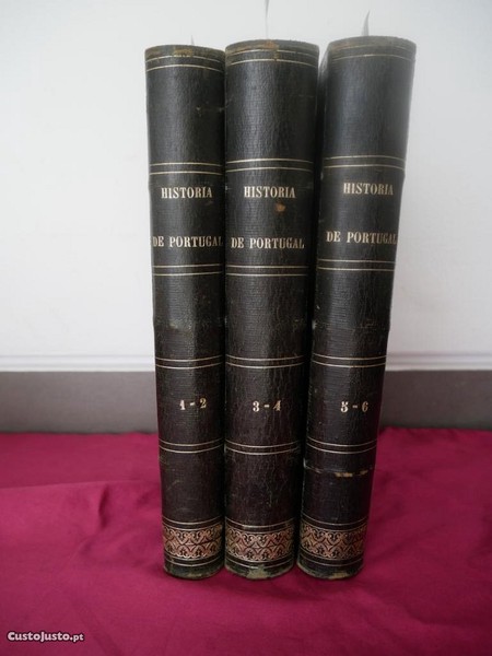 N 14236 História de Portugal por António Ennes 1 Edição (1876-1877). 6 Volumes em 3 tomos. Bernardino Pinheiro; Eduardo Vidal; Gervásio Lobato; Luciano Cordeiro e M. Pinheiro Chagas. Invulgar. Illustrações de Manuel Macedo. Officina Typográfica de J. A. De Mattos. Encadernados. 19x25,5cm. Mínimos defeitos e/ou pequenas manchas do tempo: