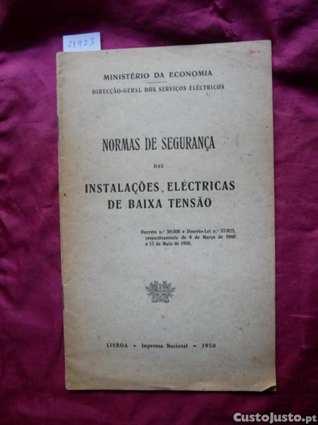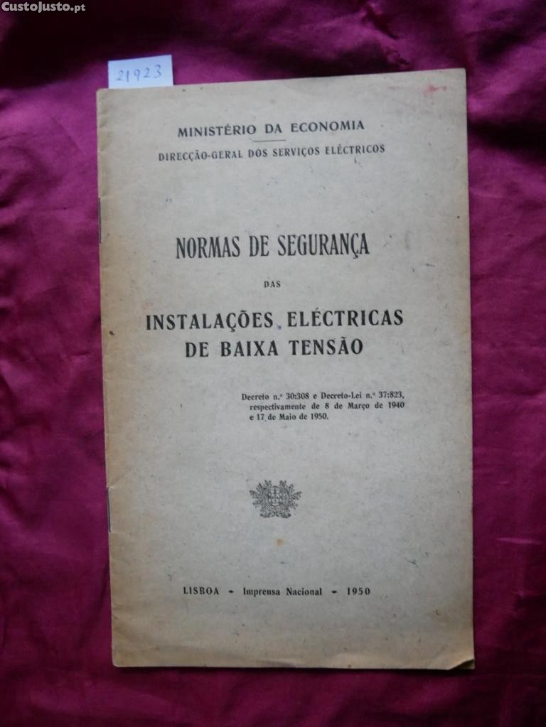 N 21923 Normas de segurança das Instalações Eléctricas de Baixa Tensão. Lisboa Imprensa Nacional 1950. 18 Pgs. 14,5x23cm.