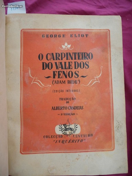 N 13301 O Carpinteiro do Vale dos Fenos. (Adam Bede) popr George Eliot. Edição integral. Tradução de Alberto Candeias. Editorial Inquérito 1943. 411 Pgs. 19x23,5cm. Encadernado. Conservas as capas de brochura. Alguns vestígios de humidade visível ao longo do livro