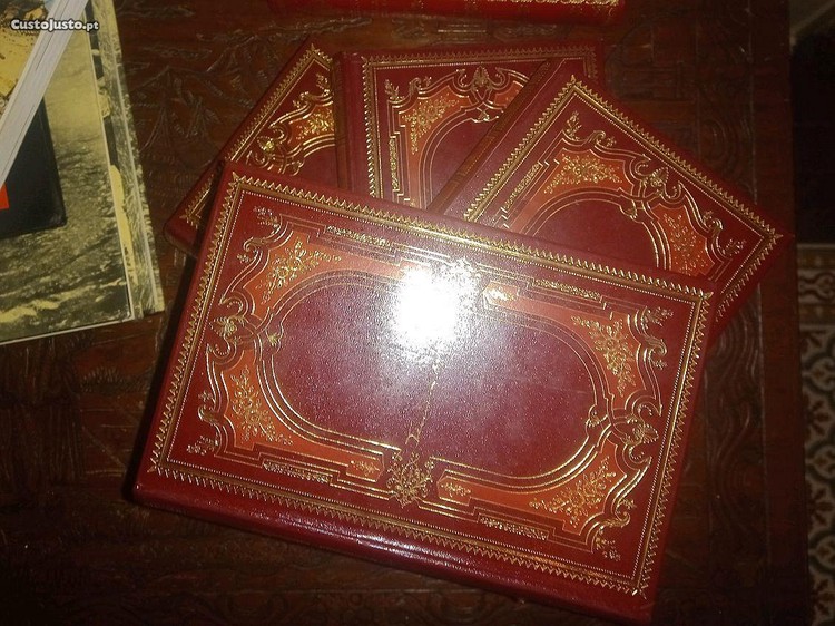 Capa dura, livros forrados a percalina vermelha, com a assinatura decalcada a ouro.