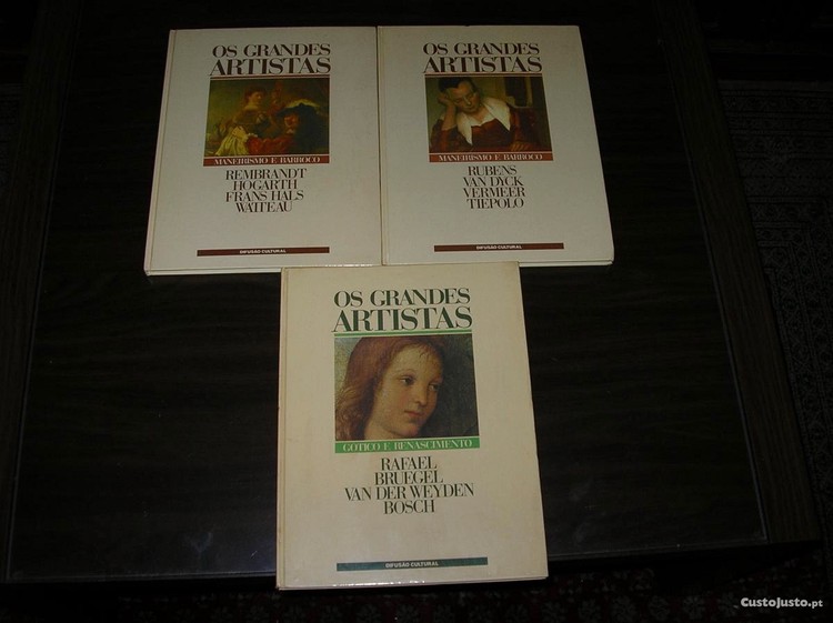 Difusão Cultural, 1990. . Gótico e Renascimento: Rafael, Brueghel, Van der Weiden, Bosch. . Maneirismo e Barroco: Rembrandt, Hogarth, Frans Hals, Watteau. . Maneirismo e Barroco: Rubens, Van Dyck, Vermeer, Tiepolo. Cada Volume: EUR 7 Entrego em mão ou via CTT (portes não incluídos).