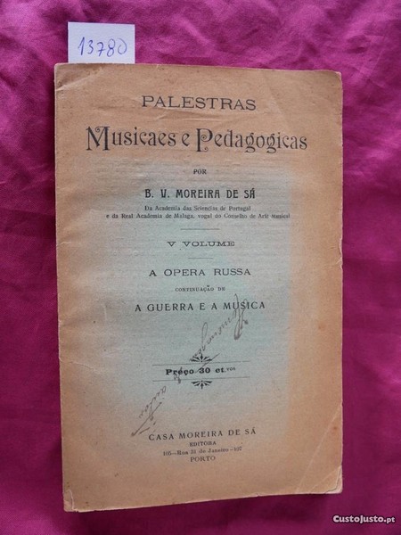 N 13780 - Palestras Musicaes e Pedagógicas por B. V. Moreira de Sá. Bernardo Valentim Moreira de Sá (1853 - 1924). Músico, maestro, compositor e professor da Academia de Sciências de Portugal e da Real Academia de Malaga, Vogal do Conselho de Arte Musical. V Volume, A Ópera Russa. 17,5x12,5cm. 112 Pgs. Continuação de A Guerra e a Música. Casa Moreira de Sá Editora, Porto 1917
