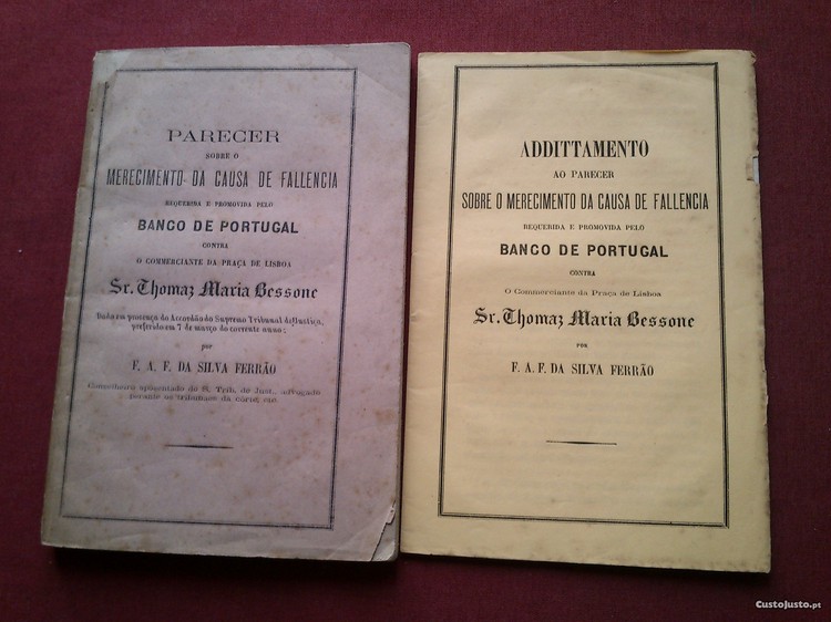 Parecer (Mais Addittamento ao Parecer) Sobre o Merecimento da Causa de Fallencia Requerida e Promovida Pelo Banco de Portugal Contra o Commerciante da Praça de Lisboa Sr. Thomaz Maria Bessone (Dado Em Presença do Accordão do Supremo Tribunal de Justiça,Proferido Em 7 de Março do Corrente Anno) por F.A.F. da Silva Ferrão (Conselheiro Aposentado do S. Trib. de Just.,Advogado Perante os Tribunaes da Corte,Etc)-Lisboa-Typographia do Futuro-1865