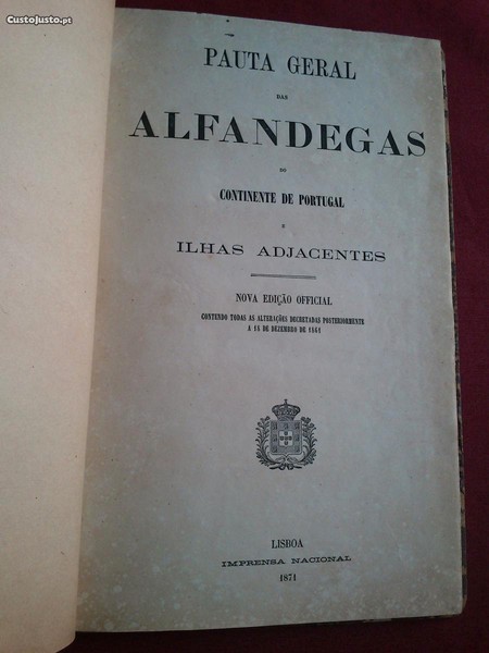 Pauta Geral das Alfândegas do Continente de Portugal e Ilhas Adjacentes-Nova Edição Official Contendo Todas As Alterações Decretadas Posteriormente a 18 de Dezembro de 1861-Imprensa Nacional-Lisboa-1871