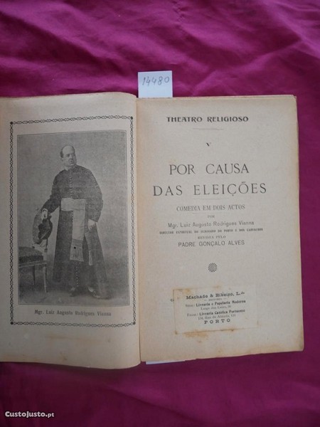 N 14480 Por Causa das eleições. Comédia em dois actos por Mgr Luis Augusto Rodrigues Vianna. Machado e Ribeiro Editores. Preço 300 Réis. 12x19cm. 64 pgs. Muito bom estado. MUITO RARO.