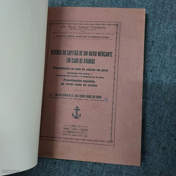 Dr. Raúl César Ferreira-Deveres do Capitão de Um Navio Mercante Em Caso de Avarias:Procedimento No Caso de Avarias Em Geral (Constatação das Avarias-A Reparação das Avarias-O Desembaraço do Navio-Procedimentos Especiais,em Certos Casos de Avarias)-Com Um Prefácio do Dr. Júlio Augusto Borges dos Santos-Papelaria,Livraria e Tipografia Fernandes & C.ª-Lisboa-1931