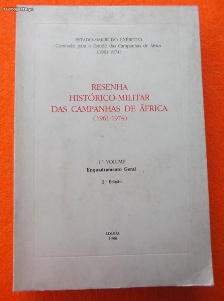 Livro Resenha Histórico-Militar das Campanhas de África (1961 - 1974) 1. vol. Enquadramento geral . Edição Estado-Maior do Exército. Comissão para o Estudo das Campanhas de África de 1988 com 532 páginas + 3 mapas desdobraveis . Livro em bom estado . Inclui portes em correio editorial .