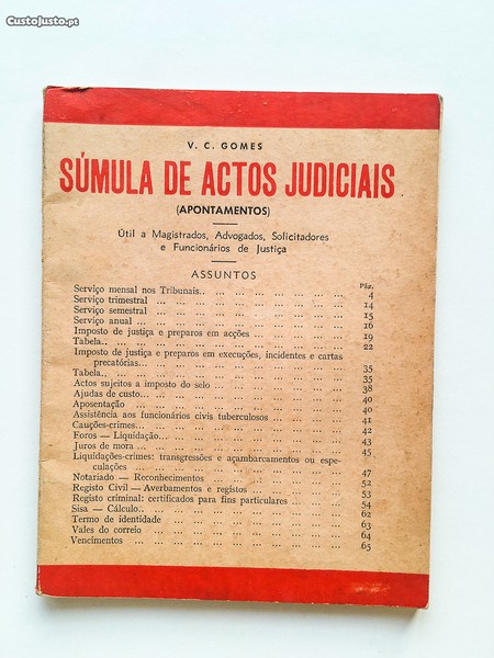 Precatórias... Tabela.. ... Actos Sujeitos a Imposto do Selo. Ajudas de Custo... ..., Aposentação ... Assistência aos Funcionários Civis Tuberculosos Cauções-Crimes... Foros - Liquidação...... Juros de Mora ... Liquidações-Crimes: Transgressões e Açambarcamentos ou Especulações.. Notariado - Reconhecimentos ... Registo Civil -- Averbamentos e Registos ... Registo Criminal: Certificados para Fins Particulares .... Sisa