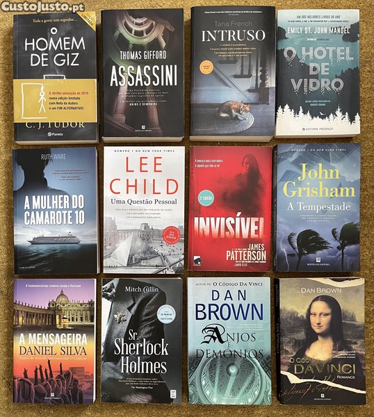 O Homem de Giz - C.J. Tudor 7 (reservado) Assassini - Thomas Gifford 7 Intruso - Tana French O Hotel de Vidro - Emily St. John Mandel 7 A Mulher do Camarote 10 - Ruth Ware 7 (reservado) Uma Questão Pessoal - Lee Child 7 Invisível - James Patterson e David Ellis 7 A Tempestade - John Grisham 5 A Mensageira - Daniel Silva 7 (vendido) Sr. Sherlock Holmes - Mitch Cullin 6 Anjos e Demônios - Dan Brown 4 O Código Da Vinci - Dan Brown 4 Acresce portes em correio editorial. Livros em bom estado, podem ter data e assinatura de posse