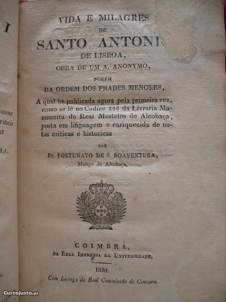 OBRA DE UM A[UTOR] ANONYMO, PORÉM DA ORDEM DOS FRADES MENORES, A qual he publicada agora pela primeira vez, como se lê no Codice 286 da Livraria Manuscrita do Real Mosteiro de Alcobaça, posta em linguagem e enriquecida de notas criticas e historicas por Fr. FORTUNATO DE S. BOAVENTURA, Monge de Alcobaça. COIMBRA, na Real Imprensa da Universidade. 1830. - [folha de rosto latim]: VITA ET MIRACULA S. ANTONII OLISIPONENSIS, AB ANONYMO, sed ORDINIS MINORUM, conscripta, Quae ex Alcobacensi Codice MS. 286 nunc primum edita, Lusitane reddebat, criticis et historicis adnotationibus locupletabat Fr. FORTUNATUS A. D. BONAVENTURA, Monachus Alcob. CONIMBRICAE, Ex Typographia Academico-Regia. A. D. MDCCCXXX [1830].