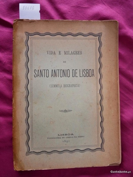 N 10618 Vida e Milagres de Santo António de Lisboa. (Súmmula Biográfica). Lisboa, Typographia do Jornal a Noite. Anno de 1891. 96 Páginas. 14,5x20,5 cm. Sinais exteriores de uso. Restauro na lombada.