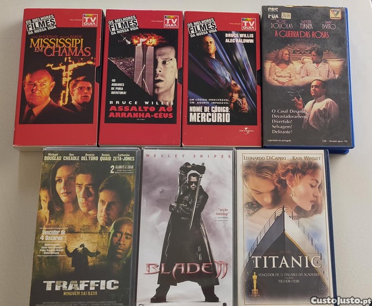 7 Cassetes em ótimas condições: Mississipi em Chamas (3EUR), Assalto ao Arranha-céus (3EUR), Nome de Código: Mercúrio (3EUR), A guerra das Rosas (4EUR), Traffic (4EUR), Blade II (4EUR), Titanic (5EUR). Conjunto 20EUR