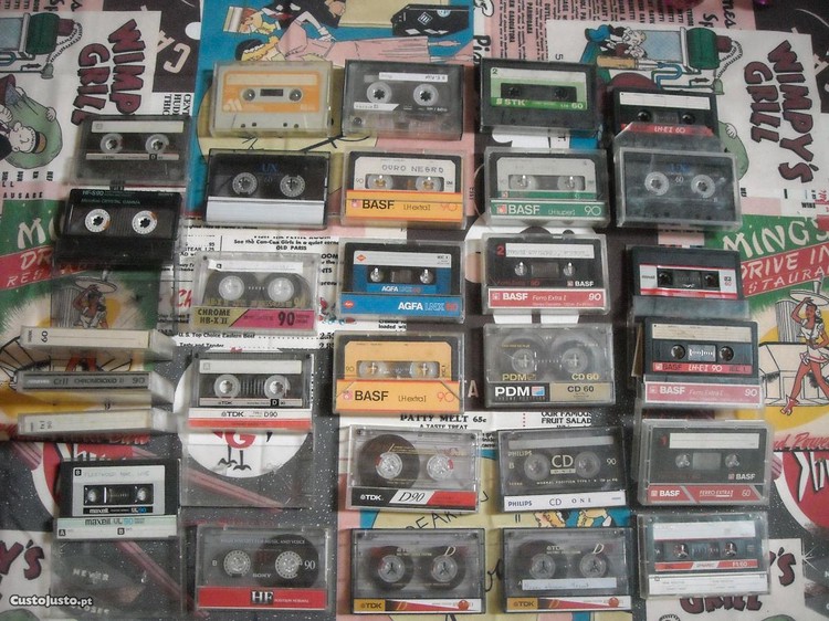 Diversas cassetes audio antigas (umas mais antigas que outras) de diversas marcas e modelos