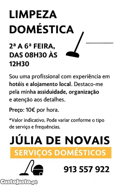 Sou Júlia De Novais, profissional, com vasta experiência em limpezas domésticas, hotéis e alojamento local.