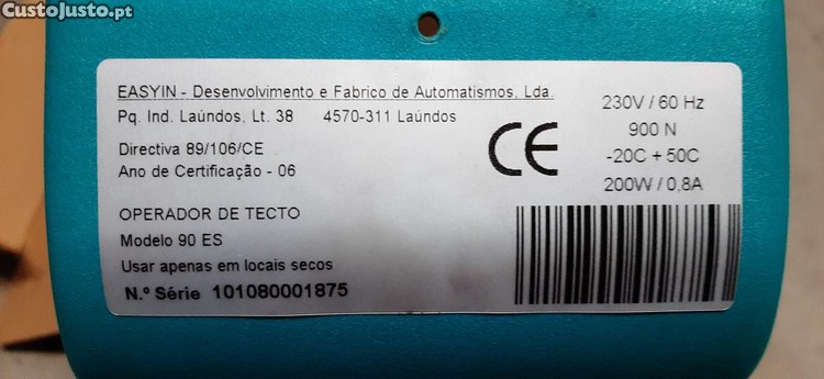 tenho 2 motores de teto de portão de garagem com avarias, da marca EASYIN , modelo 90 ES, com calhas e correntes, valor unitário 59,00 EUR. Um deles tenho peças novas para se colocar com fatura de compra do representante desta marca, tenho livro de instruções de origem