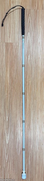 A bengala é revestida com película refletora branca para maior segurança e visibilidade, tendo na sua estrutura uma pega fácil em borracha preta macia de 25 cm, com cordão ajustável e grip, para melhor aderência à mão.